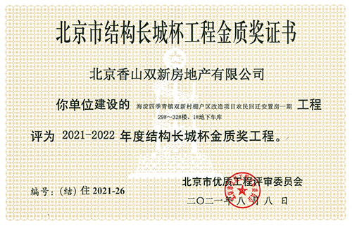 喜訊!由北京香山雙新房地產(chǎn)有限公司建設(shè)的海淀區(qū)四季青鎮(zhèn)雙新村棚戶區(qū)改造項(xiàng)目農(nóng)民回遷安置房一期(29#~32#樓、1#地下車庫)工程,榮獲2021-2022年度北京市建筑結(jié)構(gòu)長城杯金質(zhì)獎(jiǎng)工程。